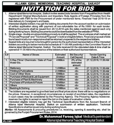 Allama Iqbal Memorial Teaching Hospital Sialkot Tender Notice